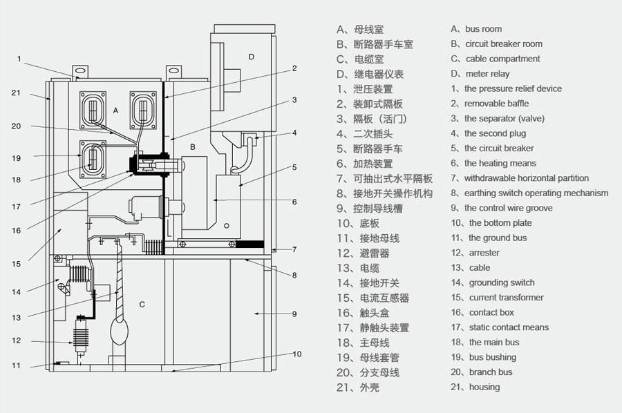 电缆室可装多达9根单芯电缆,设备有可靠的机械、电气联锁装置,完全满足“五防”要求。各室设有泄压通道,确保运行人身安全。