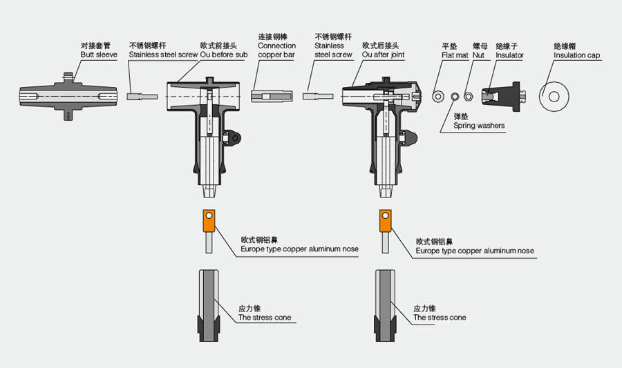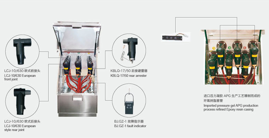 欧式电缆分接箱是近年来广泛用于电力配网系统中的电缆化工程设备,它的主要特点是双向开门、利用穿墙套管作为连接母排,具有长度小、电缓排列清楚、三芯电缆不需要大跨度交叉等显著优点。其所采用的电缆接头符合DIN47636标准。一般采用额定电流630A螺栓固定连接式电缆接头。